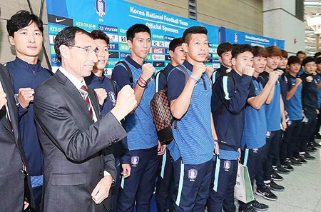 مربیان تیم کره با لباس فرم و بازیکنان با پیراهن و شلوار ورزشی وارد هواپیما شدند و در اين بین اوله اشتلیکه سرمربی آلمانی و کیسونگ یونگ کاپیتان تیم با رسانهها گفتوگوی کوتاهی داشتند و نسبت به پیروزی در ایران ابراز خشنودی کردند.