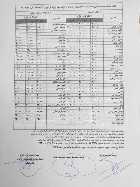 براساس اعلام سازمان میادین میوه و تره بار شهرداری قیمت هر کیلو پیاز قرمز در میادین میوه و تره بار ۳۳۰۰ تومان، پیاز زرد و سفید ۳۰۰۰تومان، خیار رسمی۴۷۰۰ تومان، خیار کوتاه و گلخانهای ۴۵۰۰ تومان، سیب زمینی ۲۸۰۰ تومان، فلفل دلمه سبز ۷۵۰۰ تومان، فلفل ریز شیرین ۷۹۰۰ تومان، فلفل ریز تند ۵۵۰۰ تومان، فلفل کاپی و شمشیری۷۹۰۰ تومان، فلفل کبابی۶۵۰۰ تومان، کاهو پیچ سالادی۵۹۰۰ تومان، کاهو رسمی پاک کرده ۴۹۰۰ تومان، گوجه فرنگی خوشهای۵۸۰۰ تومان، گوجه فرنگی گیلاسی و زیتونی ۵۳۰۰ تومان، گوجه فرنگی گلخانهای۳۲۰۰ تومان، گوجه فرنگی بوتهای ۲۹۰۰ تومان، لیموترش سنگی۸۹۰۰ تومان، انار۸۵۰۰ تومان، انواع انگور ۷۲۰۰ تا ۱۰ هزارتومان، سیب زرد ۸۸۰۰ تومان، سیب قرمز ۸۰۰۰ تومان، سایر انواع سیب (دورنگ، گلاب و …) ۸۳۰۰ تومان، موز۱۶۹۰۰ تومان، نارنگی۵۹۰۰ تومان، هلوی انجیری ۹۱۰۰ تومان، هلوی هسته جدا۸۹۰۰ تومان و هلوی کاردی۸۵۰۰ تومان است.