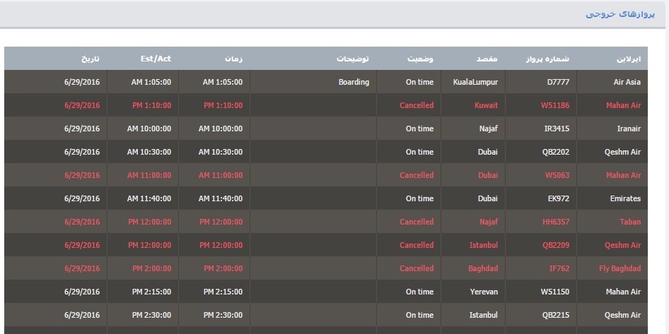 به جز پروازهای خروجی به مقصد استانبول،برخی از پروازها به مقصد بیروت،کویت وبغداد هم لغو شده است.