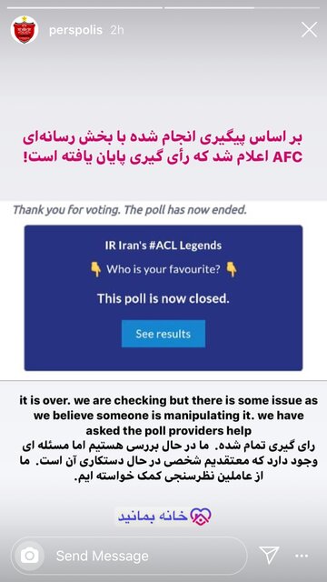 در همین رابطه، اینستاگرام پرسپولیس مدعی شده که درباره اتفاقات اخیر در این نظرسنجی با بخش رسانهای AFC مکاتبه کرده و آنها اعلام کردند شخصی در حال دستکاری در نتایج نظرسنجی است.