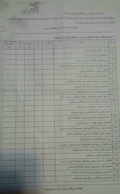 به گزارش صلح خبر در روزهای اخیر، در برخی سالن های سینمایی از جمله سالن های مردمی جشنواره فجر یکسری فرمهای نظرسنجی به مخاطبان داده شده که سوالات مختلفی را مطرح کرده است.