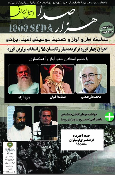 پنجمین برنامه هزار صدا در بخش کلاسیک ایرانی، برای انتخاب دو گروه برگزیده بهار و تابستان ۹۵ عصر جمعه نهم مهر ماه و با حضور محمدعلی بهمنی،هنگامه اخوان و داود آزاد در بخش داوری و اجرای فاضل جمشیدی،حسین و پژمان پرنیا برگزار میشود.