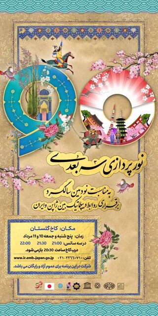 مدیر مجموعه میراث جهانی کاخ گلستان خبر داد: سفارت ژاپن در ایران با همکاری کاخ گلستان به مناسبت بزرگداشت نودمین سالگرد برقراری روابط دیپلماتیک بین ژاپن و ایران، نورپردازی سهبعدی با موضوع روابط دوستانه بین دو کشور را در مجموعه میراث جهانی کاخ گلستان از ۱۰ تا ۱۱ مرداد به نمایش میگذارد.