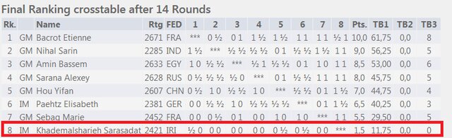 خادم الشریعه با این نتایجی که به دست آورد با ۱.۵ امتیاز در رده هشتم و آخر باقی ماند.