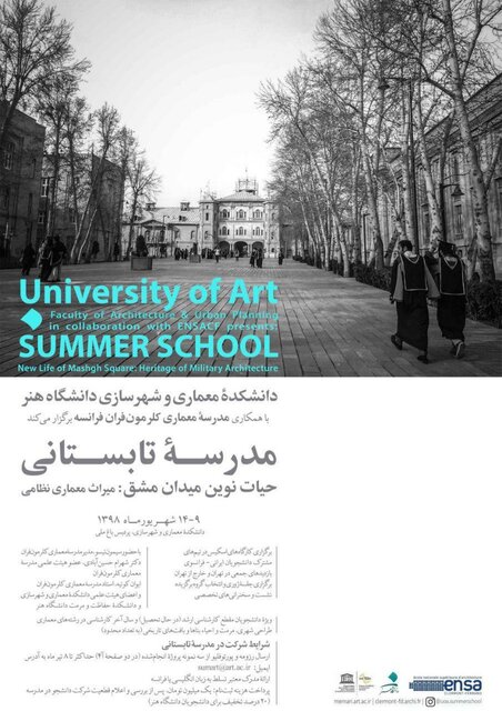 در همین راستا، کمیته برگزاری مدرسه، از متقاضیان در مقطع کارشناسی ارشد و سال پایانی مقطع کارشناسی در رشتههای معماری، طراحی شهری، مرمت و احیای بافت و بناهای تاریخی دعوت میکند تا مدارک خود (شامل رزومه و پورتفلیو در دو صفحه A4 و تسلط به یکی از زبانهای انگلیسی و فرانسوی) را حداکثر تا ۸ تیرماه سال جاری به نشانی sumart@art.ac.ir ارسال کنند. همچنین از میان متقاضیان، افراد واجد شرایط توسط این کمیته انتخاب شده و با شرایط اعلامشده از آنها ثبتنام به عمل میآید.