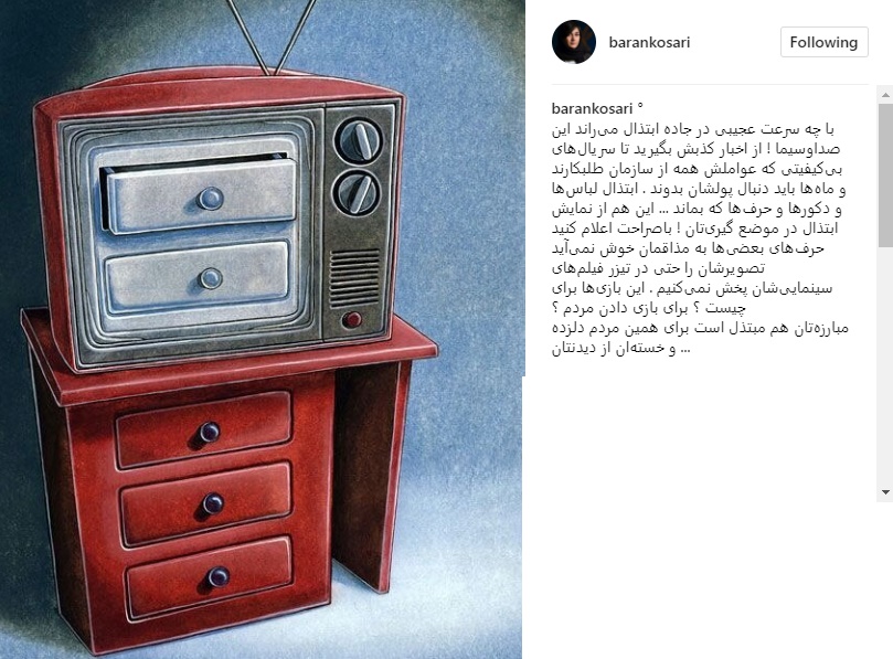 این بازیگر در این باره نوشت: «با چه سرعت عجیبی در جاده ابتذال میراند این صداوسیما، از اخبار کذبش بگیرید تا سریالهای بیکیفیتی که عواملش همه از سازمان طلبکارند و ماهها باید دنبال پولشان بدوند. ابتذال لباسها و دکورها و حرفها که بماند … این هم از نمایش ابتذال در موضع گیریتان، باصراحت اعلام کنید حرفهای بعضیها به مذاقمان خوش نمیآید و تصویرشان را حتی در تیزر فیلمهای سینماییشان پخش نمیکنیم. این بازیها برای چیست؟ برای بازی دادن مردم؟