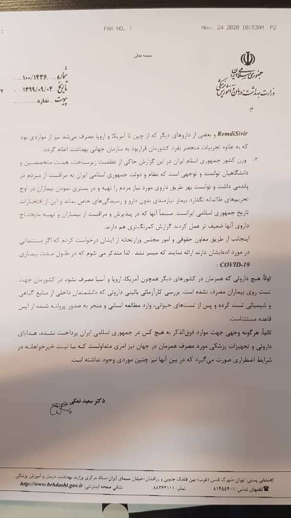 وزیر بهداشت نوشته است: با وجود پیگیری ادعاهای مطرح شده در مصاحبه مذکور تا این لحظه نامبرده هیچ سندی برای ادعاهای خود ارائه نکرده است.