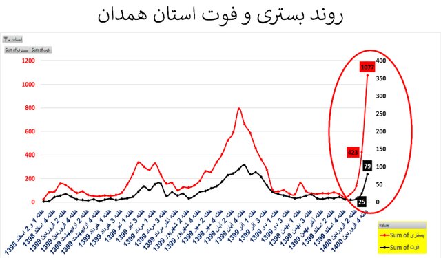 در همدان نیز افزایش نگرانکننده موارد بستری و فوت در هفته اخیر مشاهده میشود. بروز موارد بستری از متوسط کشوری بیشتر شده و میزان مرگومیر نیز از متوسط کشور بیشتر شده است.