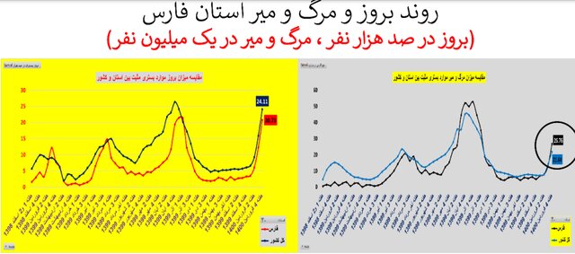 در استان فارس نیز در این هفته موارد فوت افزایش یافته و موارد بستری نیز به طرز نگرانکنندهای افزایش یافته است. میزان بروز موارد بستری هنوز از متوسط کشوری کمتر است. اما میزان مورتالیتی از متوسط کشوری بیشتر شده است.