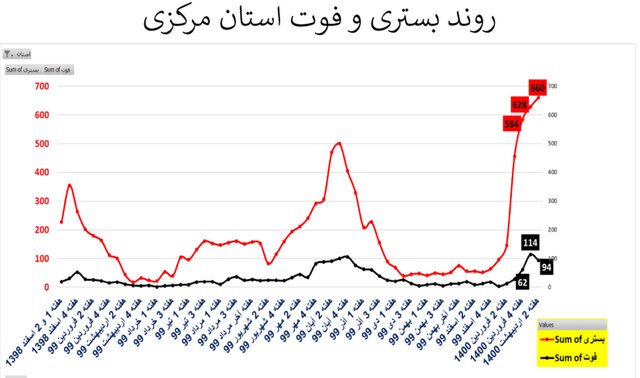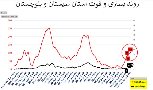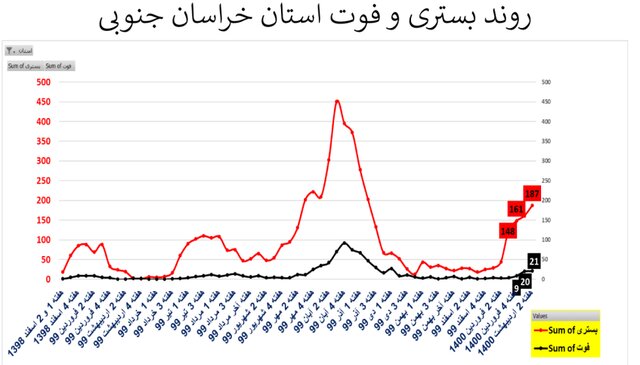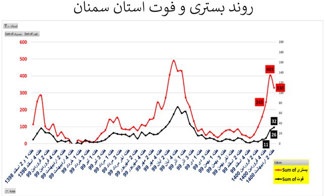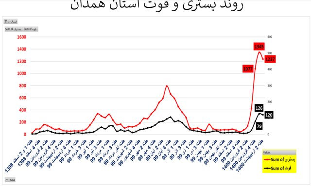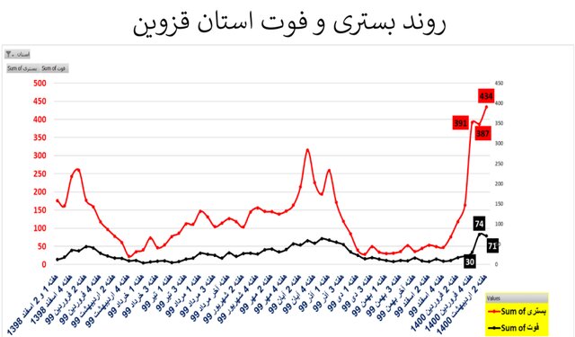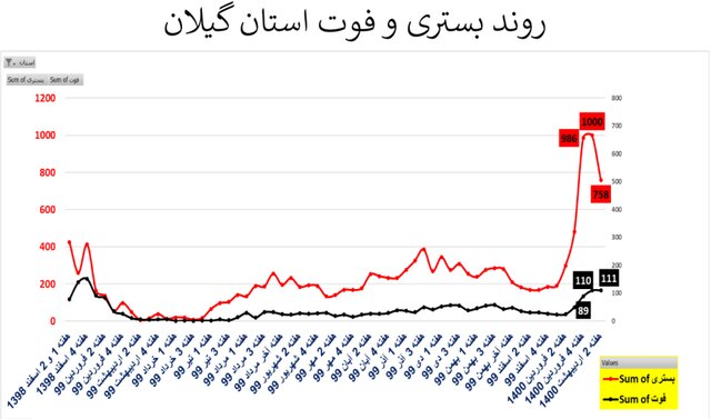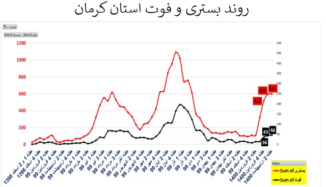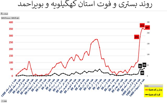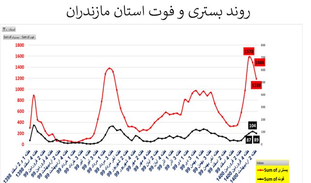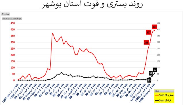 روند بستری در هفته اخیر افزایش، اما موارد فوت کاهش یافته است. با این حال بروز موارد بستری و مرگ و میر ناشی از بیماری همچنان از متوسط کشوری بالاتر است.
