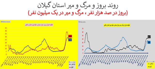 موارد بستری استان در این هفته مجددا افزایش یافته، اما فوت کاهش یافته است. البته همچنان بروز موارد بستری و مرگ و میر استان از متوسط کشوری بالاتر است.