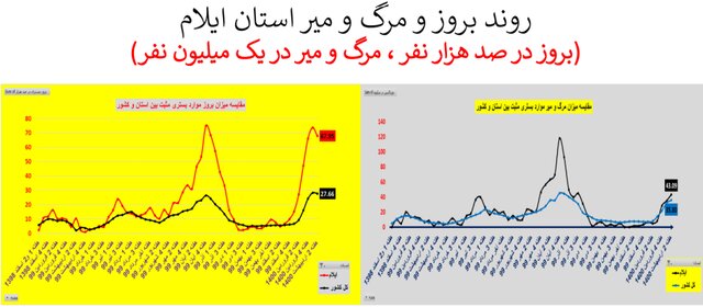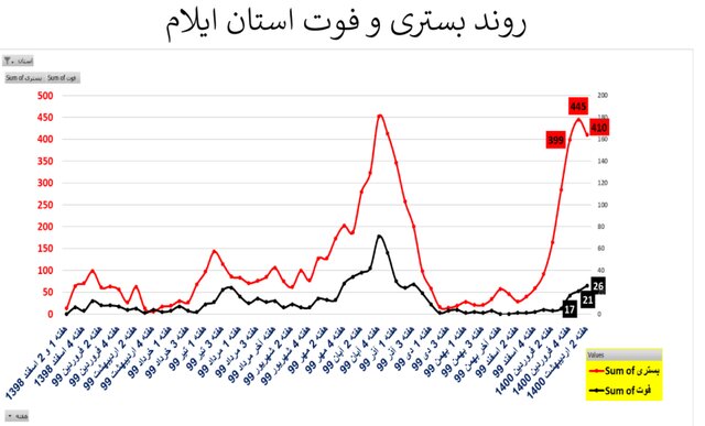در هفته اخیر در ایلام کاهش روند بستری و افزایش فوت مشاهده شده است، در این هفته میزان بروز موارد بستری و میزان مرگ و میر از متوسط کشور بیشتر شده است.
