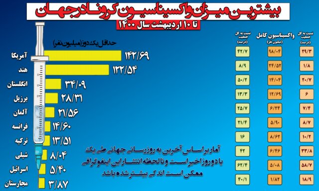 بنابر اعلام مرکز روابط عمومی و اطلاع رسانی وزارت بهداشت، تا کنون ۸۸۹ هزار و ۹۵ نفر دُز اول واکسن کرونا و ۲۱۱ هزار و ۸۲۲ نفر نیز دُز دوم را تزریق کرده اند و مجموع واکسن های تزریق شده در کشور به یک میلیون و ۱۰۰ هزار و ۹۱۷ دُز رسید.