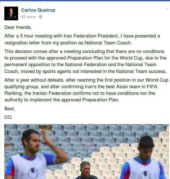 «بعد از جلسه با رئیس فدراسیون فوتبال ایران که 5 ساعت به طول انجامید، من نامه استعفای خود را از سمت هدایت تیم ملی ایران تقدیم ایشان کردم.