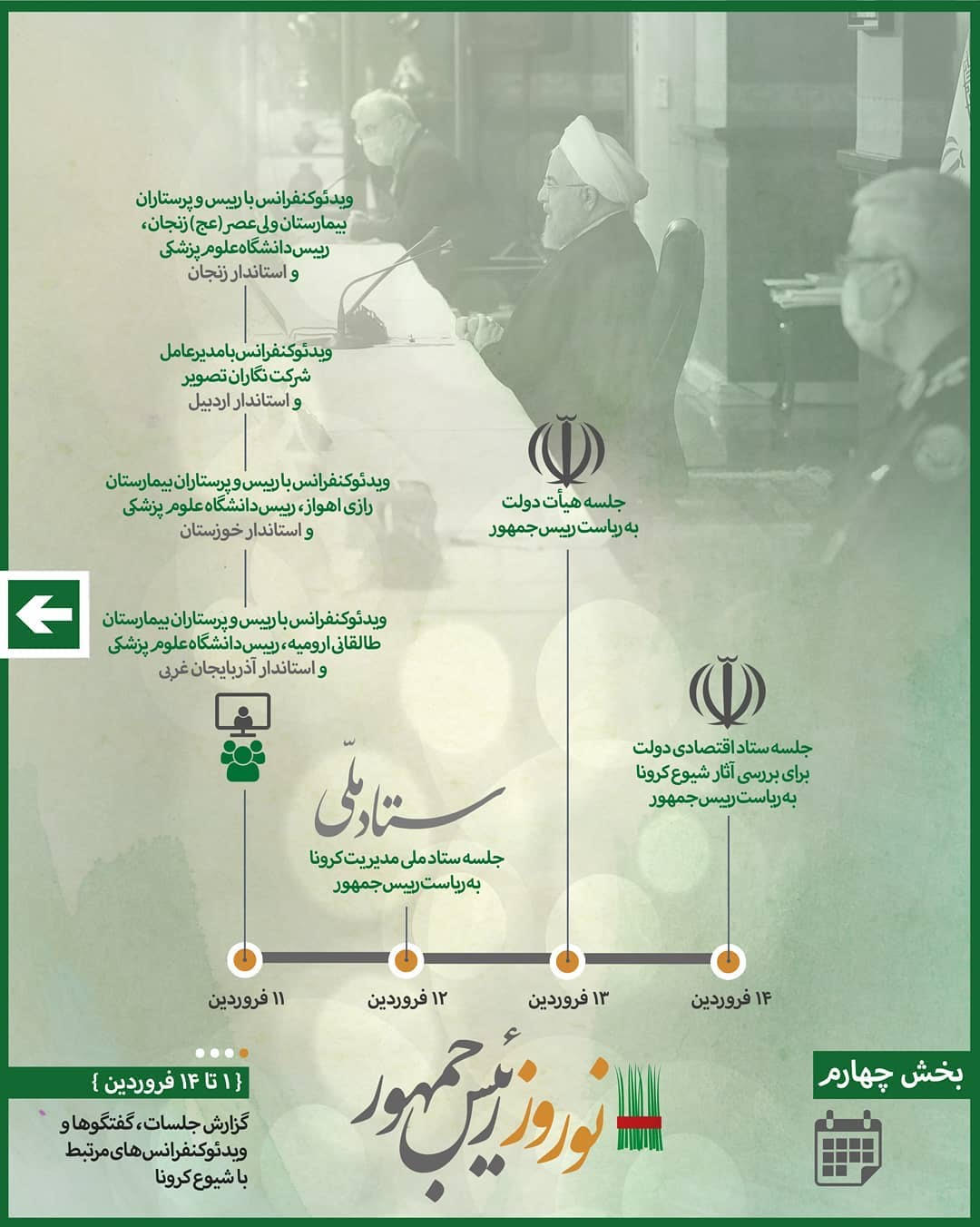 این جلسات و برنامههای مرتبط با کرونا، عمده برنامه کاری رییسجمهور در دو هفته نخست سال ۱۳۹۹ و از دقایقی پس از تحویل سال نو بود که شرح مختصر آنها در تصاویر این پست آمده است.