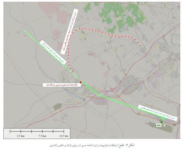 ۱۸- آخرین ارتباط موشک با سامانه پدافندی در زمان ۰۶:۱۵:۲۴ در مکانی نزدیک مسیر حرکت هواپیما ثبت شده است. پس از آن، پیام موفقیت آمیز نبودن عملکرد موشک در سامانه نشان داده می شود و هواپیما پس از مدتی از قفل راداری سامانه خارج میشود (شکل ۵).