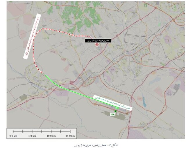 ۲۱- هواپیما در ساعت ۰۶:۱۸:۲۳ در منطقه خلجآباد در نزدیکی شاهدشهر در موقعیت مشخص شده در شکل و در یک زمین بازی به زمین برخورد میکند. همزمان با برخورد هواپیما با زمین، انفجاری رخ میدهد و هواپیما در یک مسیر که به سمت فرودگاه قرار دارد در چند مرحله دیگر به زمین برخورد کرده و قطعات هواپیما، اموال و اشیاء جانباختگان و بقایای پیکر مسافران پرواز در ناحیهای گسترده در یک منطقه مسکونی پارک تفریحی و ورزشی و باغها و زمینهای کشاورزی اطراف پخش میشود.