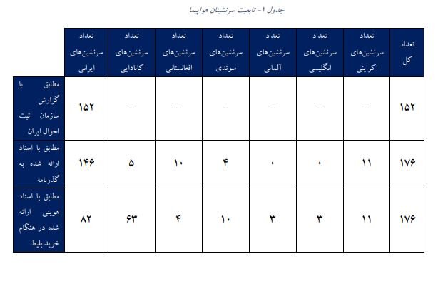 ۲۴- درباره تابعیت سرنشینان هواپیما مطابق اطلاعات دریافت شده از اسناد ارائه شده در هنگام خرید بلیط پرواز اسناد ارائه شده جهت عبور از مرز و اطلاعات موجود در سازمان ثبت احوال ایران، اطلاعات زیر قابل ارائه است.