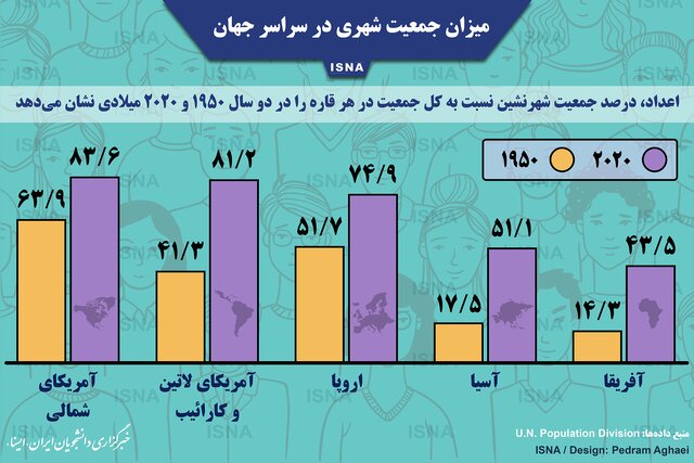 طبق آمار منتشرشده توسط بخش جمعیتی سازمان ملل متحد که به ارائه آمارهای مربوط به جمعیت در کشورهای جهان میپردازد، میزان رشد جمعیت شهرنشین در قارههای مختلف جهان روندی افزایشی داشته است. در این میان، قارههای آسیا و آفریقا بیشترین رشد جمعیت شهری طی ۷۰ سال گذشته را تجربه کردهاند. در این اینفوگرافیک، میزان جمعیت شهری در سراسر جهان، یعنی نسبت جمعیت شهرنشین به کل جمعیت در پنج قاره را مشاهده میکنید.