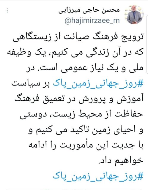 به گزارش صلح خبر، محسن حاجی میرزایی در صفحه شخصیاش در توییتر نوشت: ترویج فرهنگ صیانت از زیستگاهی که در آن زندگی می کنیم، یک وظیفه ملی و یک نیاز عمومی است.